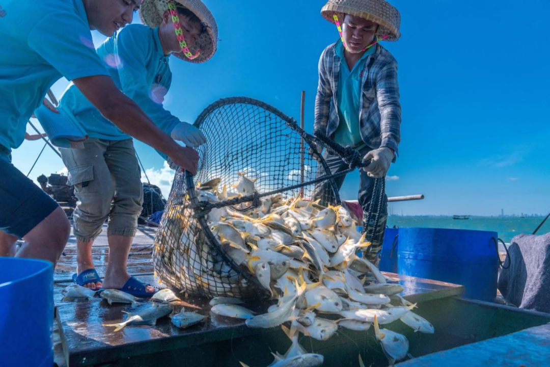 ▲南海之濱,漁獲滿倉,廣東漁民在碧海藍(lán)天下收獲滿滿一網(wǎng)金鯧魚。