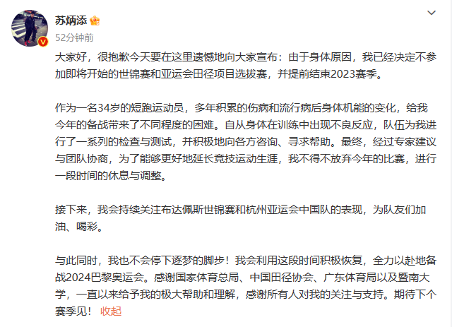 南方網(wǎng)訊 6月12日,“亞洲飛人”蘇炳添在微博平臺宣布,由于身體原因,決定不參加即將開始的田徑世錦賽和亞運會田徑項目選拔賽,提前結(jié)束2023賽季。蘇炳添表示,會利用這段時間積極恢復(fù),全力備戰(zhàn)2024巴黎奧運會。