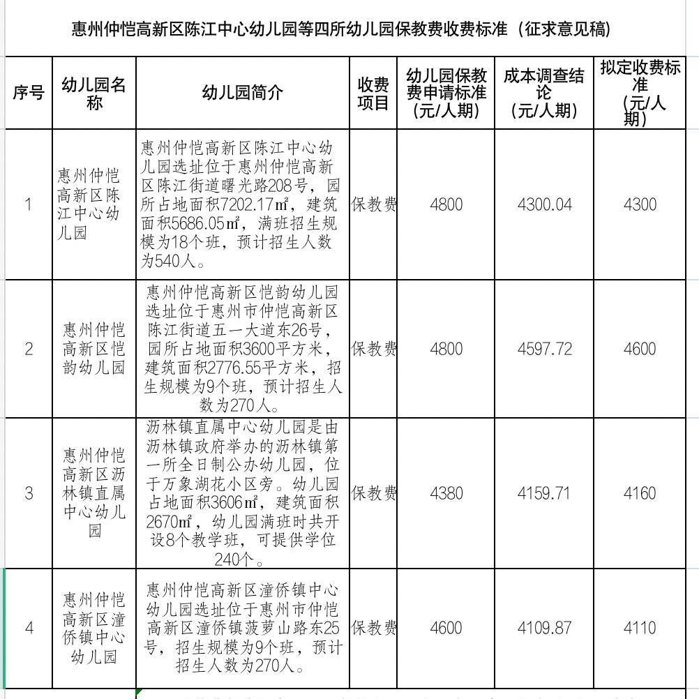2月21日,仲愷高新區(qū)科技創(chuàng)新局發(fā)布《關(guān)于征求惠州仲愷高新區(qū)陳江中心幼兒園等四所公立幼兒園收費(fèi)標(biāo)準(zhǔn)意見(jiàn)的公告》。根據(jù)現(xiàn)行保教費(fèi)申請(qǐng)標(biāo)準(zhǔn),陳江中心幼兒園、愷韻幼兒園、瀝林鎮(zhèn)直屬中心幼兒園、潼僑鎮(zhèn)中心幼兒園擬將保教費(fèi)調(diào)整為每生每學(xué)期4000元以上。