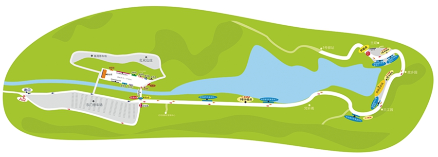 ●彩跑路線:紅花湖景區(qū)內(nèi)游客中心標(biāo)識處設(shè)起跑點和終點,主壩處設(shè)折返點,全長約6公里