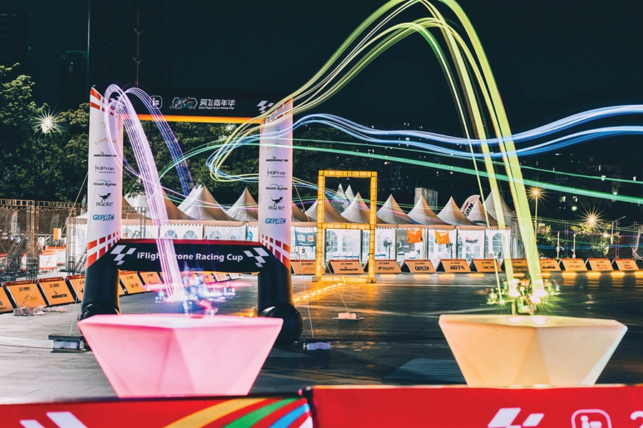 比賽中無人機飛出七彩軌跡。惠州日報記者林麗娟 通訊員佘海綽 攝
