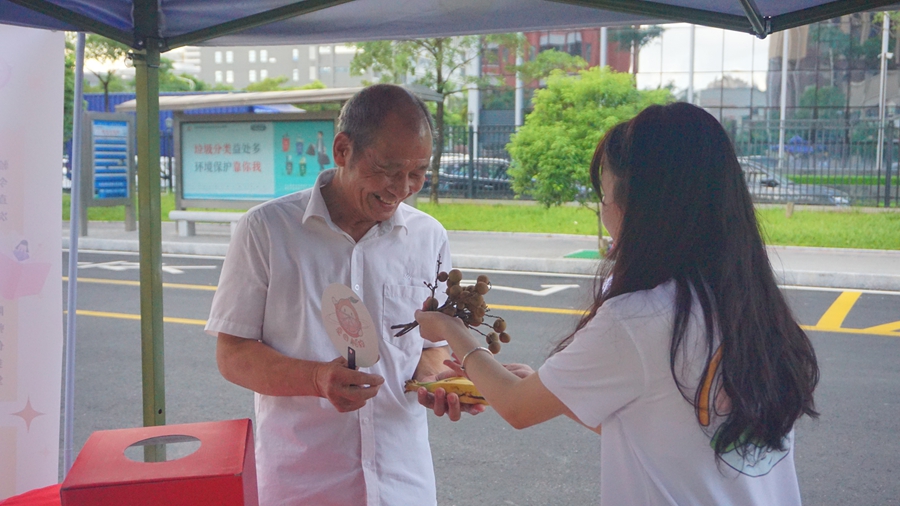 晶瑩的龍眼、香甜的芒果、飽滿的香蕉,在助農(nóng)產(chǎn)品攤上擺放著各式各樣水果,每一位前來觀看科普宣講的居民都可以免費得到。攤位上的水果均是實踐隊成員向惠州當(dāng)?shù)毓r(nóng)收購,目的是讓居民品嘗到品質(zhì)優(yōu)良的水果,“食過返尋味”,向果農(nóng)購買,以此助農(nóng)扶農(nóng)。隊員們在現(xiàn)場拿著水果在攤位上向居民們展示,詳細(xì)地介紹了水果的產(chǎn)地和風(fēng)味。前來攤位的小朋友們還在現(xiàn)場品嘗了龍眼,他們還積極地為助農(nóng)產(chǎn)品攤做宣傳,“我回去喊我朋友也來吃水果!”