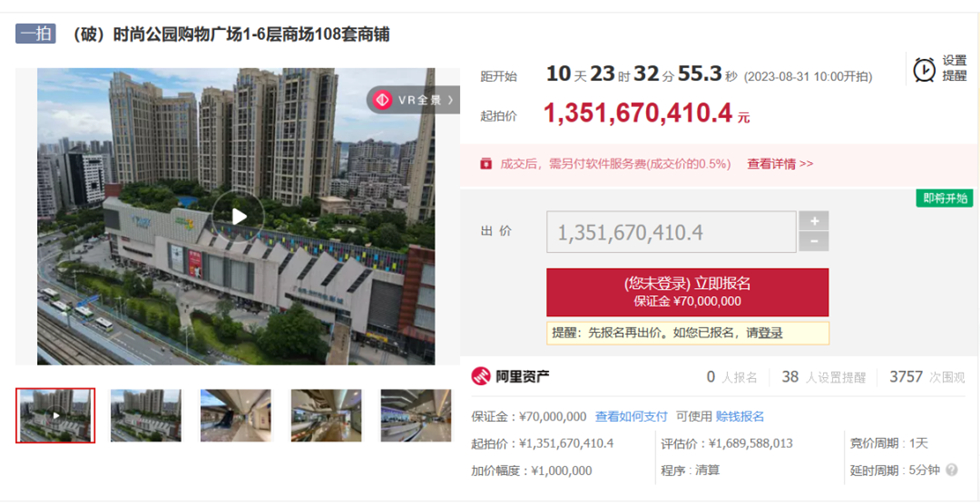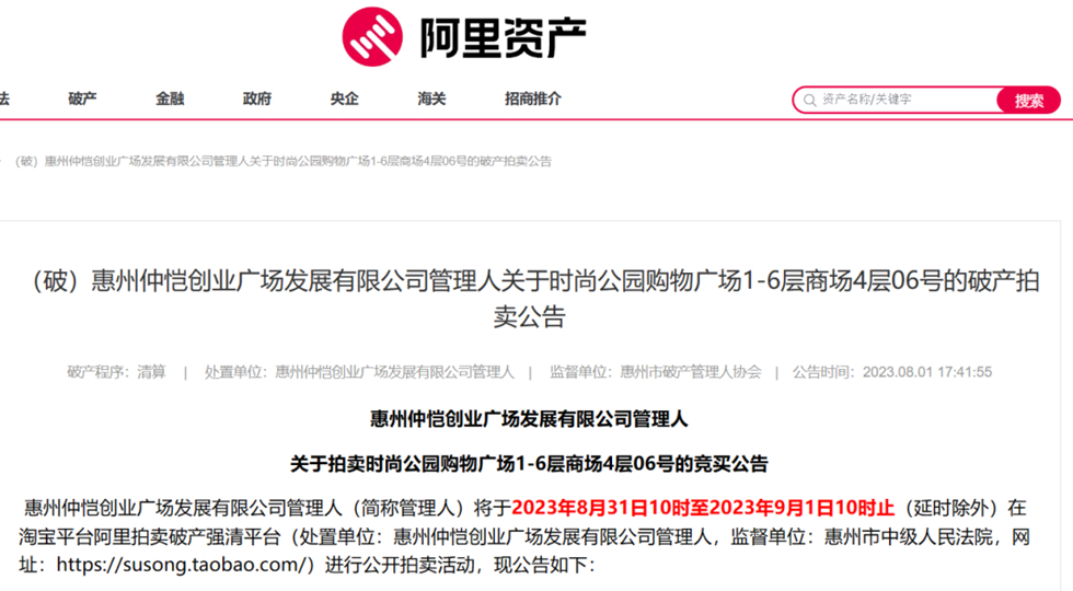 近日,阿里資產(chǎn)平臺(tái)發(fā)布了《(破)惠州仲愷創(chuàng)業(yè)廣場發(fā)展有限公司管理人關(guān)于時(shí)尚公園購物廣場1—6層商場4層06號的破產(chǎn)拍賣公告》和《時(shí)尚公園購物廣場1~6層商場108套商鋪》拍賣信息,起拍總價(jià)約13.5億元,將在2023年8月31號進(jìn)行網(wǎng)拍,引發(fā)市民關(guān)注!