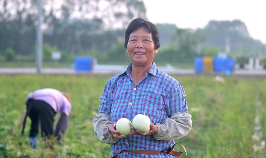 李院樂和村民一起采收白香瓜。