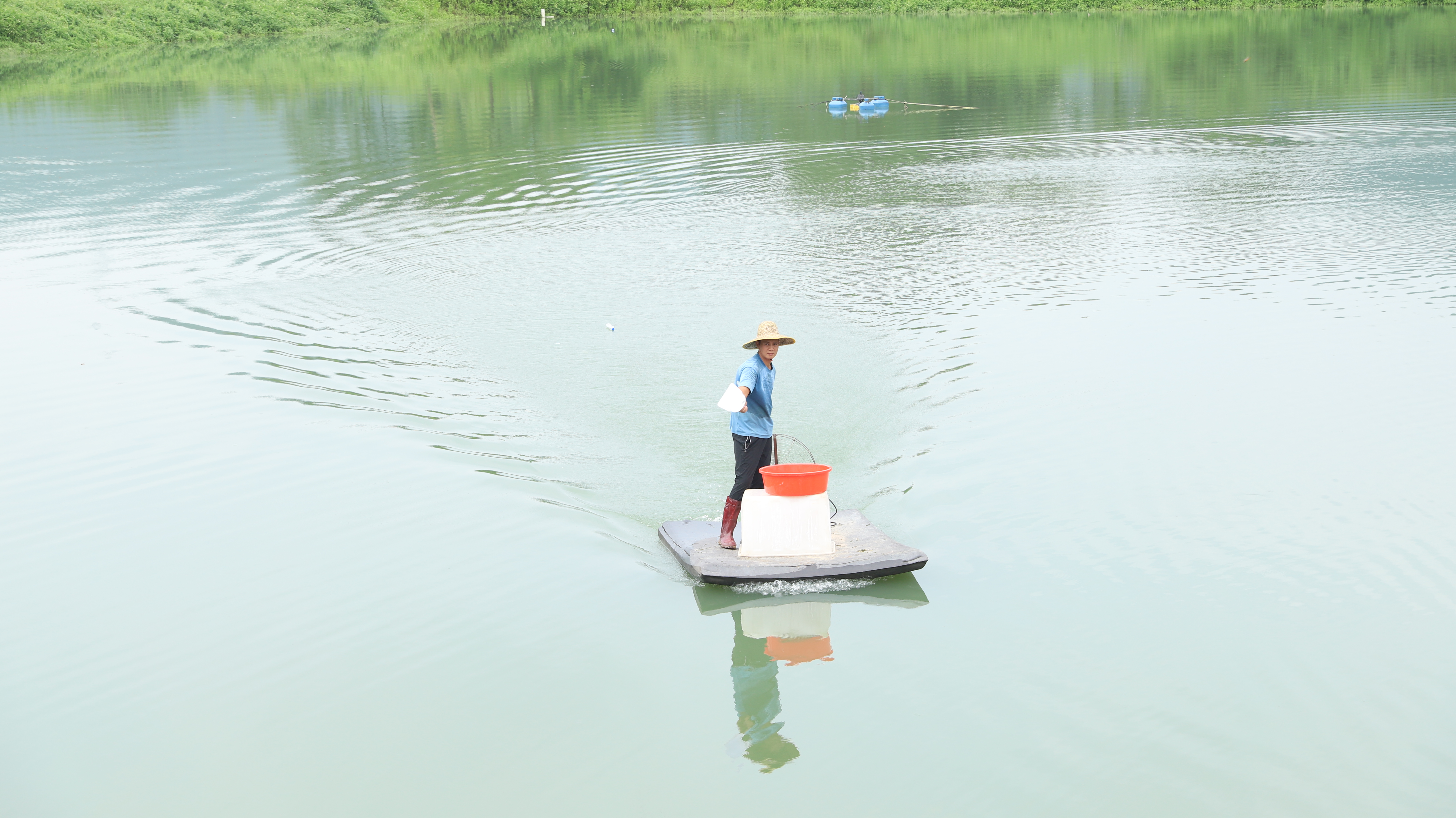 養(yǎng)殖員在水塘給蝦喂食。惠州日報記者鐘暢新 攝