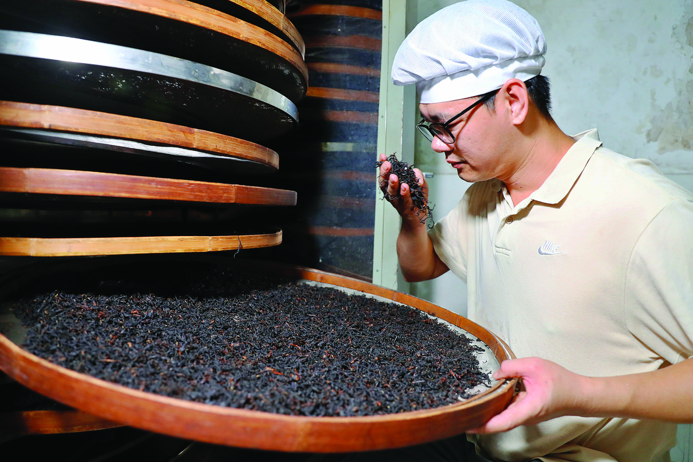 檢查茶葉的烘烤情況。