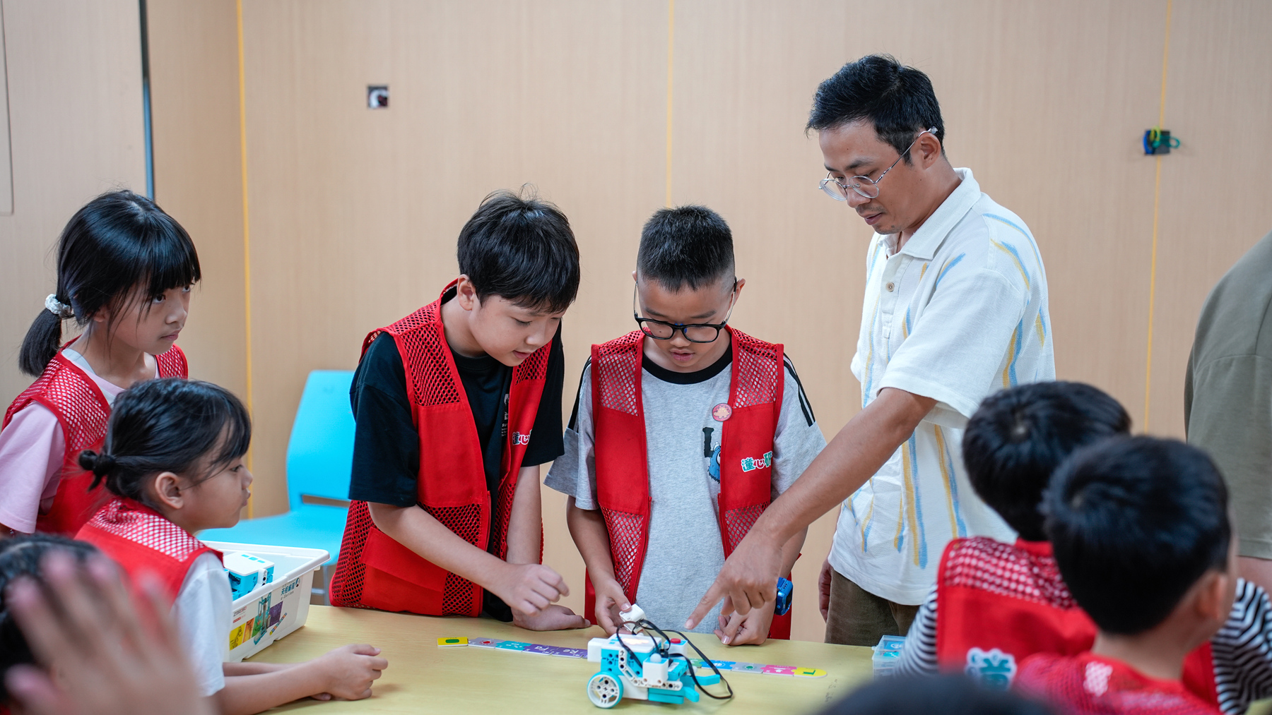 剛到達活動營地——中韓(惠州)產(chǎn)業(yè)園起步區(qū)黨群服務中心,孩子們就走進了機器人的知識世界。在這里,他們從了解機器人的驅(qū)動、感知、控制系統(tǒng)到認識手臂、電動機、傳感器等零部件,以及在醫(yī)療、工業(yè)、運輸?shù)榷鄠領域的神奇應用,心中的好奇被瞬間點燃。通過趣味實踐,孩子們親眼見證這些“法寶”如何讓機器人擁有“看”和“聽”的能力,原本抽象的科學原理瞬間變得生動易懂。