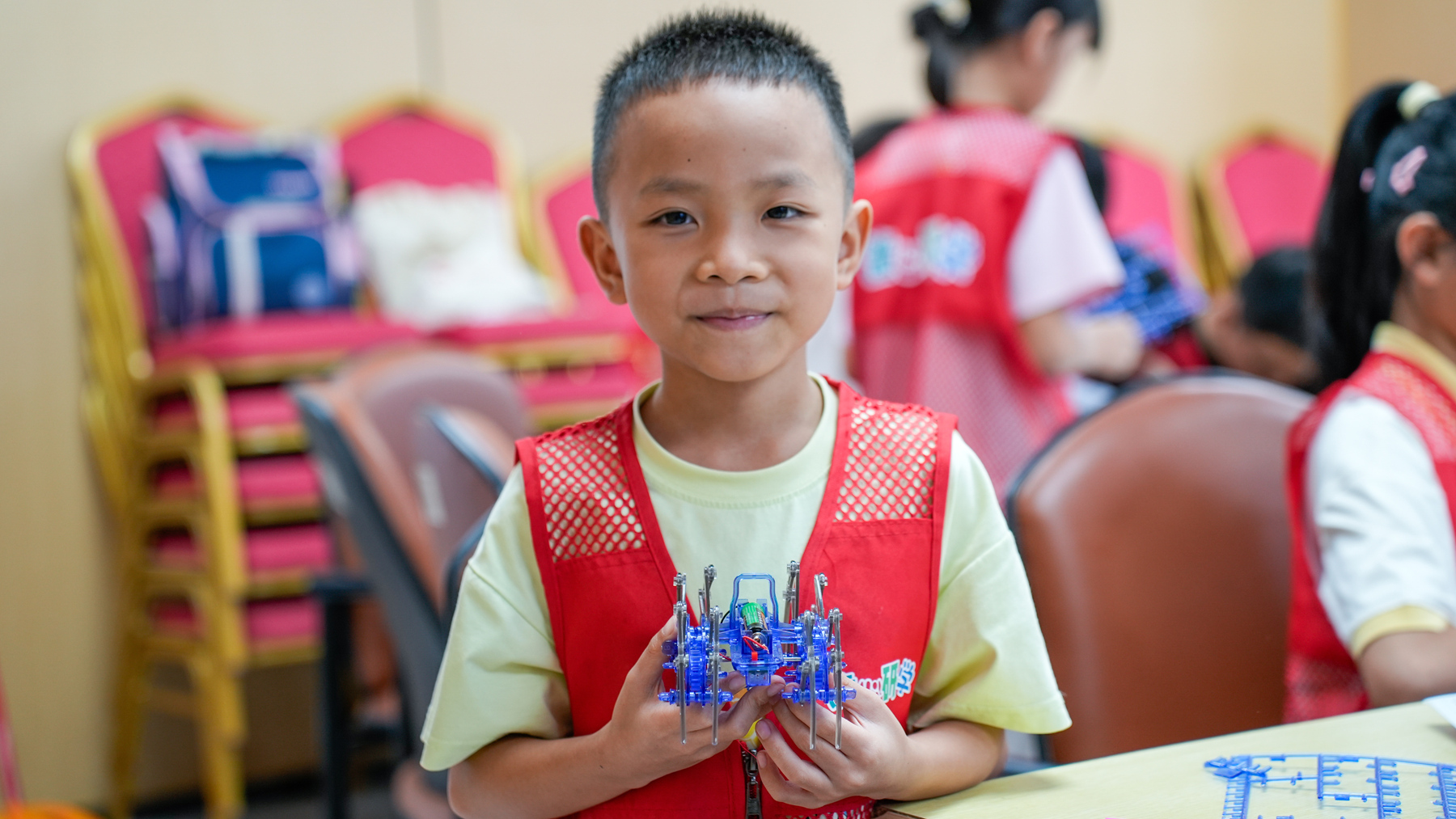 孩子拿著自己制作的機器人分享收獲