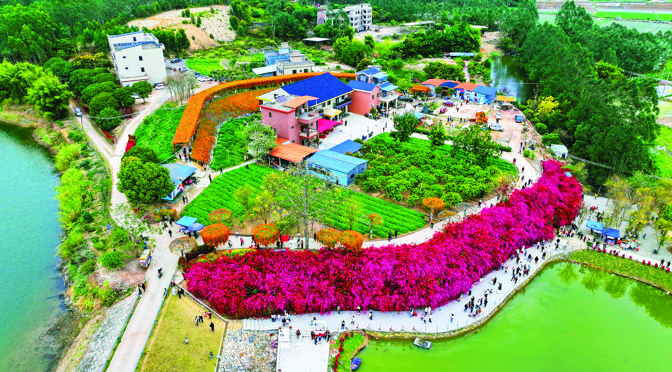 在潼湖鎮(zhèn)黃屋村,三角梅瀑布如霞似錦,這里已成為網(wǎng)紅打卡地。“2023年以來,我們年均接待游客10萬人次,帶動村里餐飲、零售等行業(yè)蓬勃發(fā)展。”潼湖鎮(zhèn)相關(guān)負(fù)責(zé)人介紹,黃屋村以三角梅瀑布花嶼項目為核心,打造集花卉觀賞、親子采摘于一體的鄉(xiāng)村旅游景點。目前項目一期已投入200萬元,完成石板路、玻璃護(hù)欄、臨時商業(yè)區(qū)等建設(shè);二期計劃投入800萬元,流轉(zhuǎn)土地擴(kuò)大花海規(guī)模,并配套建設(shè)停車場,“建成后預(yù)計每年能為村集體增收18萬元。”接下來,潼湖鎮(zhèn)還將把花果山、潼湖濕地串成“環(huán)潼湖行”精品文旅路線,讓“打卡流量”變成留住游客的“留量”。
