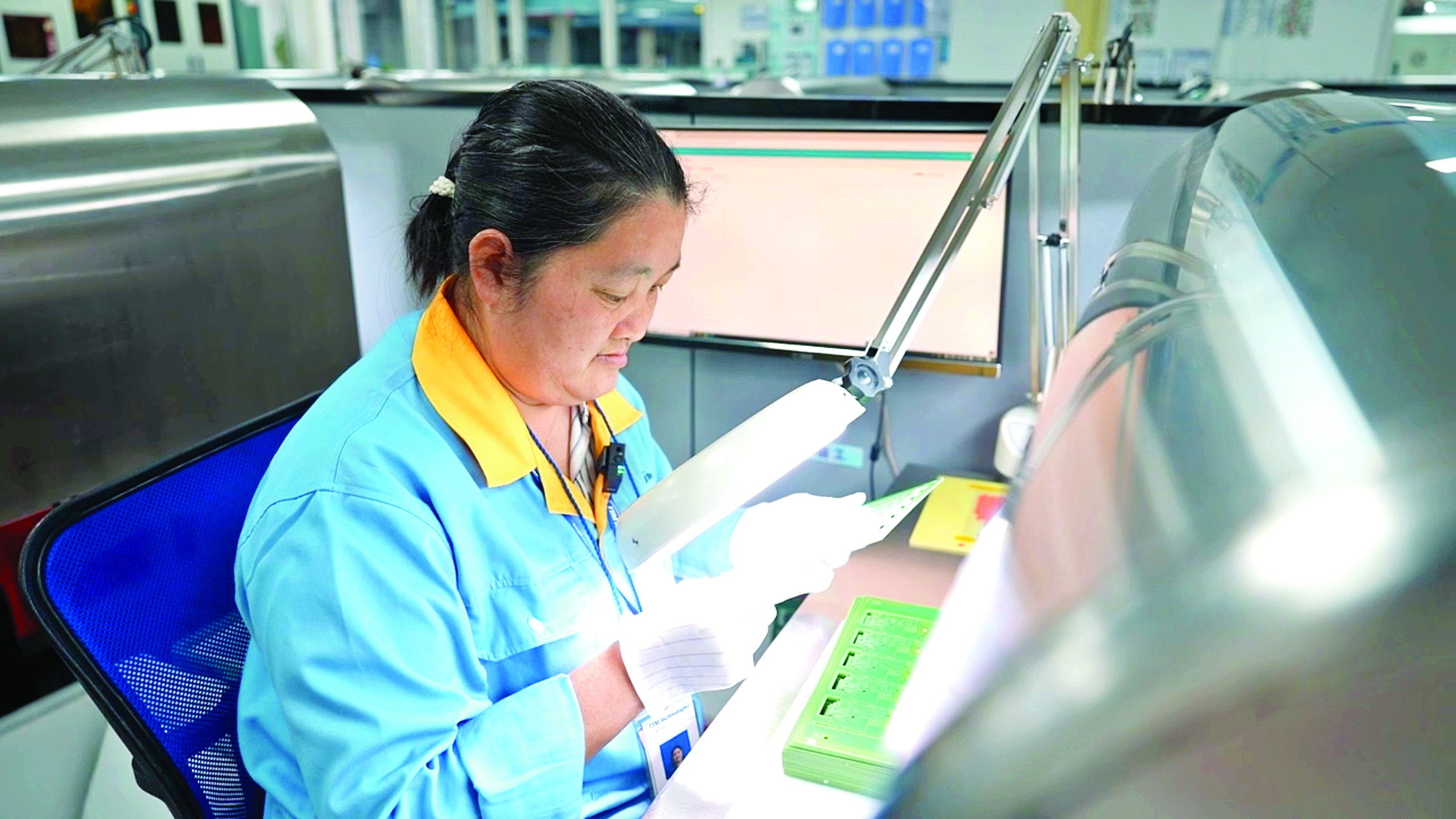 羅會(huì)玲對(duì)電路板產(chǎn)品進(jìn)行檢測(cè)。