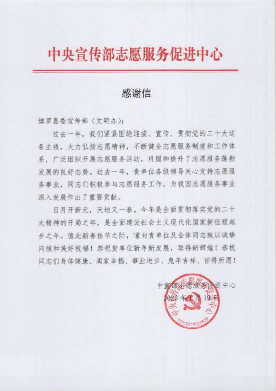 1月19日,中宣部志愿服務(wù)促進中心給博羅縣委宣傳部(文明辦)發(fā)來感謝信,感謝該縣志愿服務(wù)組織和志愿者們,在過去一年里,為博羅縣志愿服務(wù)事業(yè)深入發(fā)展作出的重要貢獻。在兔年春節(jié)之際,為全縣志愿者鼓足了干勁,為博羅志愿服務(wù)事業(yè)注入新動力。據(jù)悉,在過去一年里,在中央和省市的統(tǒng)籌指導(dǎo)下,在縣委、縣政府的正確領(lǐng)導(dǎo)下,博羅縣志愿服務(wù)工作緊緊圍繞中心、服務(wù)大局,有效對接百姓民生,積極融入生產(chǎn)生活,扎實推動志愿服務(wù)活動在博羅大地廣泛開展。