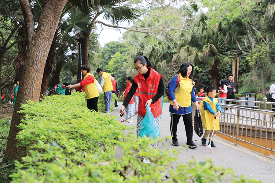 志愿者在東山森林公園撿拾垃圾。