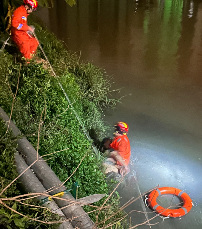 現(xiàn)場消防了解到,一名中年男子已經(jīng)跳下河。2名熟悉水性的消防員立即穿戴好個人防護裝備,系好救生安全繩、攜帶救生圈迅速下水搜救。