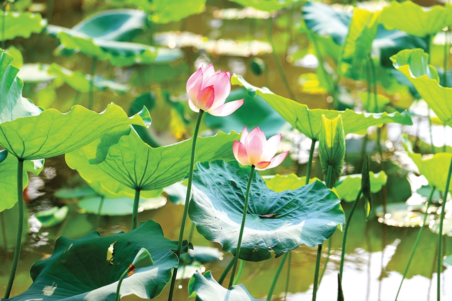 荷田處有一條別致的賞荷棧道。沿著棧道穿行,置身荷田花叢中,美得讓人陶醉。