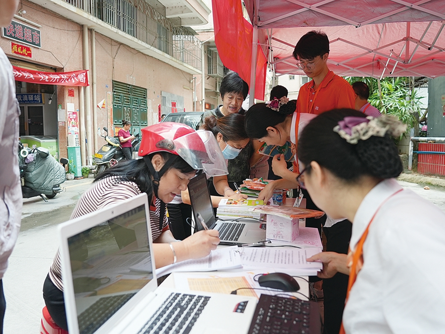 工作人員向居民宣傳老舊小區(qū)報裝的相關(guān)政策。