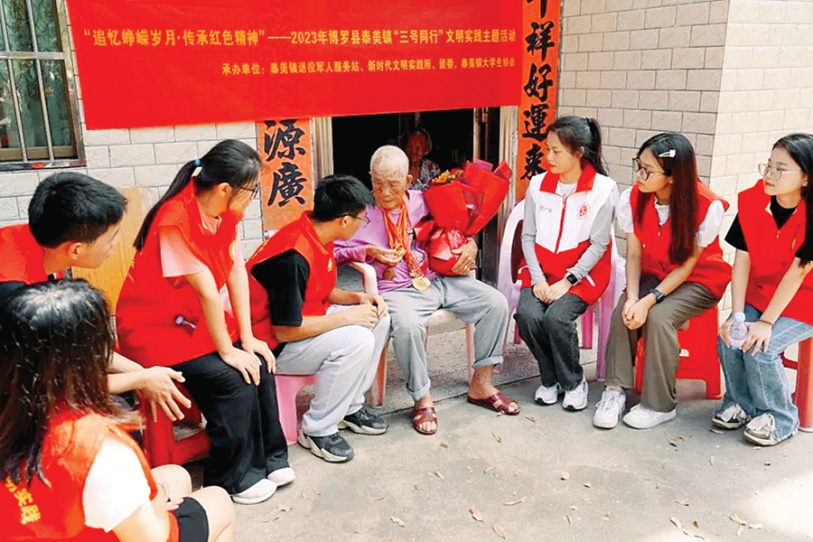 泰美鎮(zhèn)大學生協(xié)會的青年志愿者慰問老人。