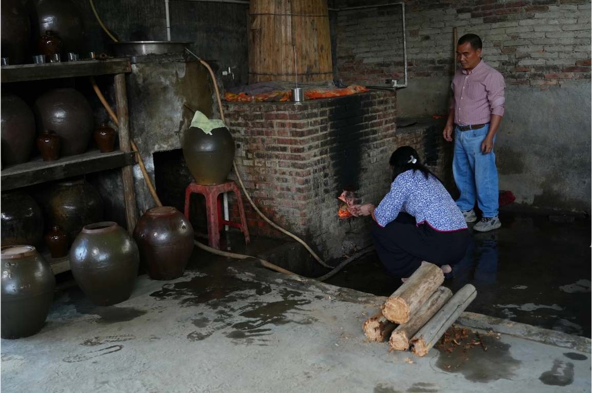 羅浮山之東,顯崗水庫(kù)旁,博羅縣湖鎮(zhèn)鎮(zhèn)金星村金沙洞一處傳統(tǒng)酒坊,酒壇整齊排列,柴火鐵鍋上蒸汽繚繞,百年土鍋燒酒釀制技藝在此上演。