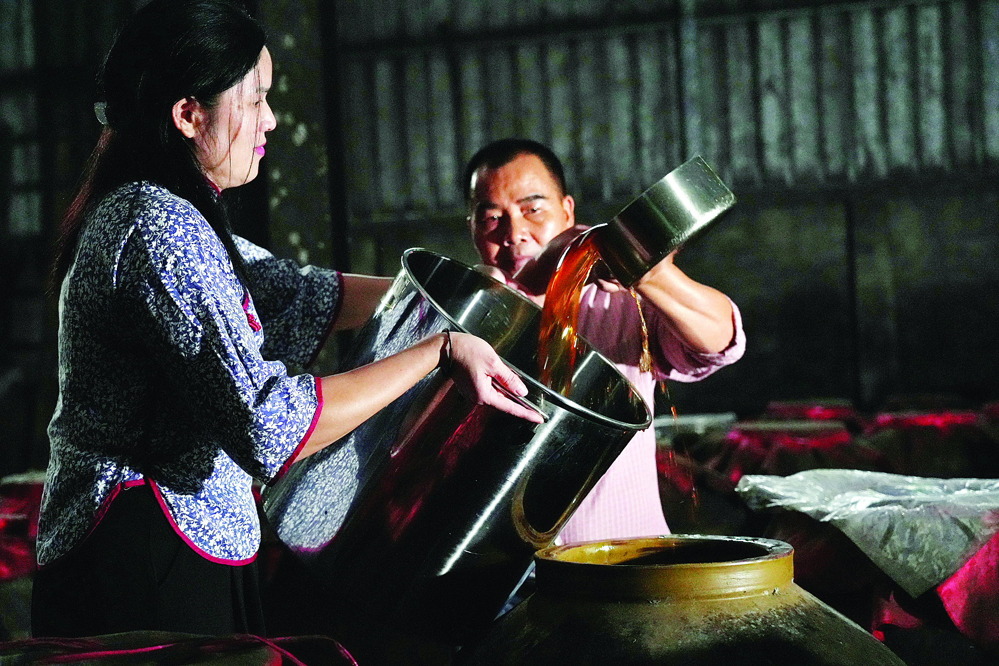 楊容添和妻子毛偉英將釀好的酒拿出來(lái)銷(xiāo)售。