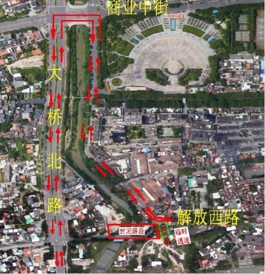 大橋北路至解放西路方向:大橋北路→商業(yè)中街→榕溪路→解放西路。