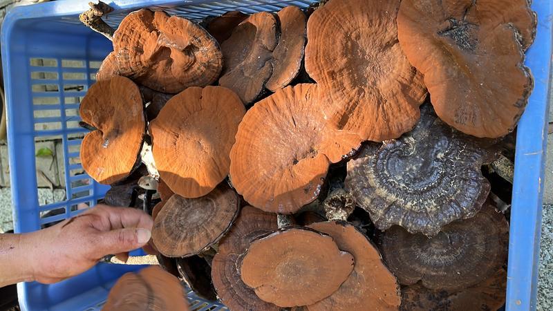 林永標(biāo)介紹,成熟的紫靈芝,從外觀上看,菌蓋周邊變黑、肉質(zhì)厚,菌蓋底部由白色轉(zhuǎn)為咖啡色或深褐色,表面可見金黃的孢子粉,質(zhì)感硬實(shí)。無論是野生的還是人工種植的靈芝,都是3個多月的生長期。“從藥用價(jià)值上來看,這種仿野生的靈芝和野生靈芝沒有什么區(qū)別。”林永標(biāo)向大家科普道,野生靈芝被采摘時(shí)還未成熟或者已老化,實(shí)際上藥用價(jià)值已大打折扣;而人工仿野生的靈芝,在成熟度剛好的時(shí)候采摘,可以大大地保留其藥用、食用價(jià)值和香味。