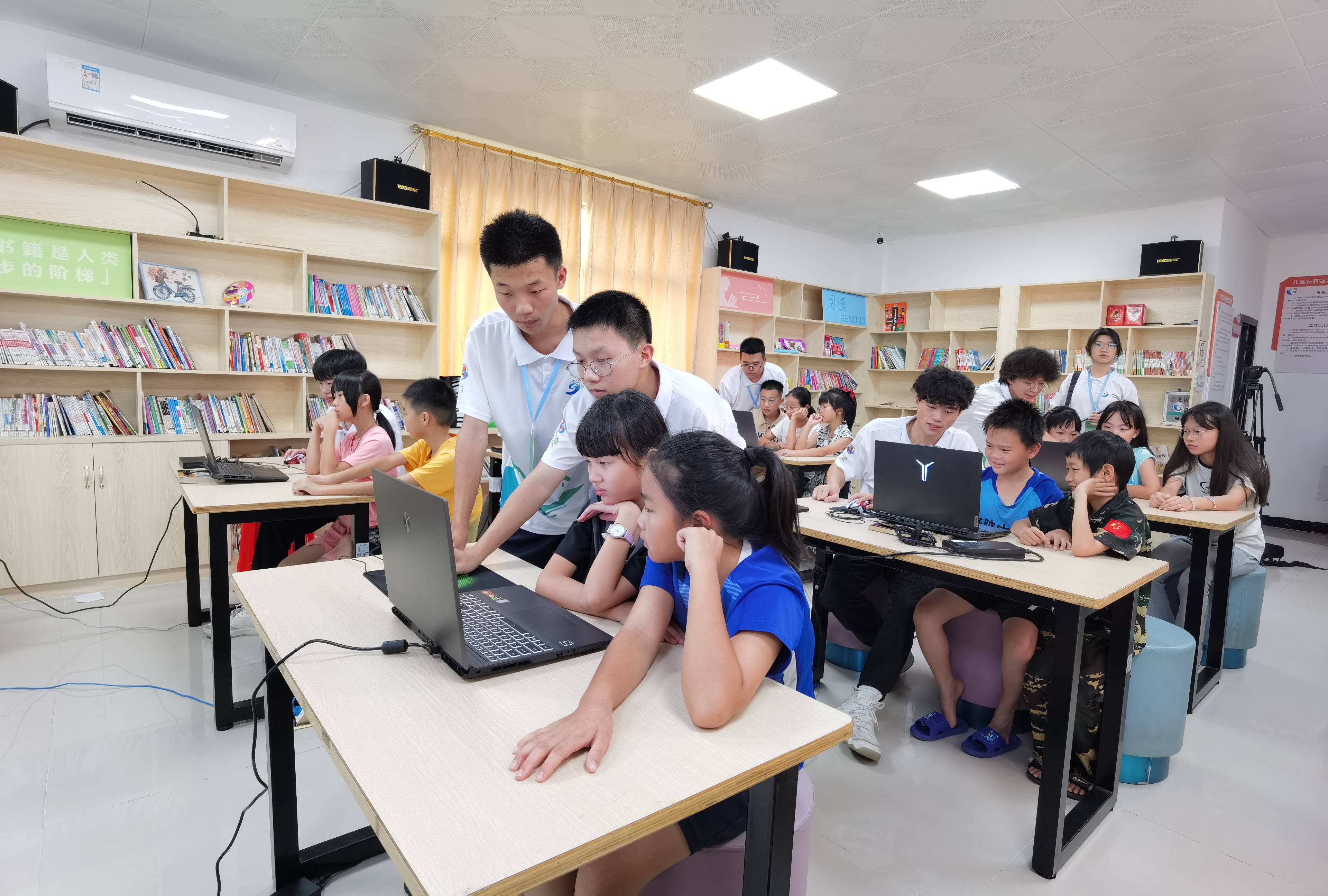 青年大學(xué)生在教麻陂少年學(xué)編程。惠州日?qǐng)?bào)記者鐘暢新 通訊員麻陂宣 攝