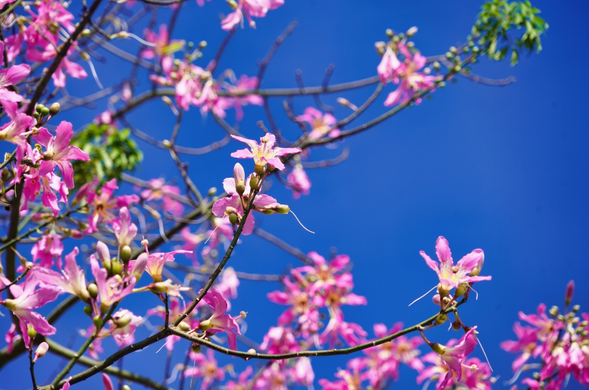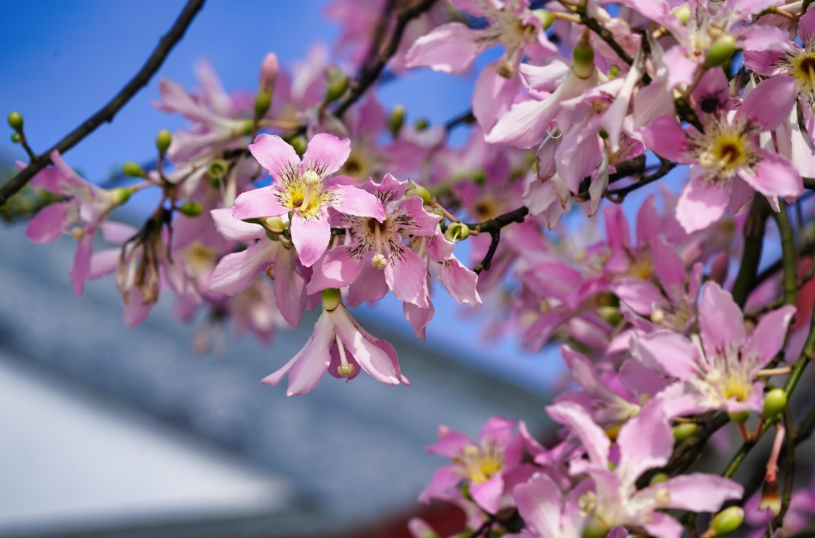 美麗異木棉是“英雄樹”的親戚,同是木棉科但不同屬,花期也不盡相同,一個開在深秋初冬,色的花朵柔美嬌艷;一個在仲春時節(jié),多為熱烈激昂的火紅色,樹體高大筆直。在藍天的映襯下,美麗異木棉樹上掛滿一簇簇花朵,大且嬌艷、燦若煙霞。偶爾抬頭欣賞一下這滿樹繁花,感受著秋日的歲月靜好。