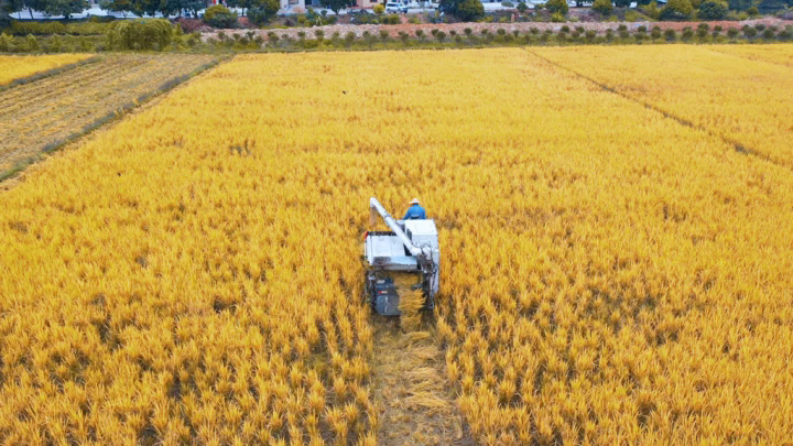 伴隨著機(jī)器的轟鳴聲,農(nóng)機(jī)手們駕駛著收割機(jī)在稻田中來(lái)回穿梭。一卷、一割間,金黃的稻谷就被“盡收囊中”,割稻、脫粒、粉碎秸稈等過(guò)程一氣呵成。