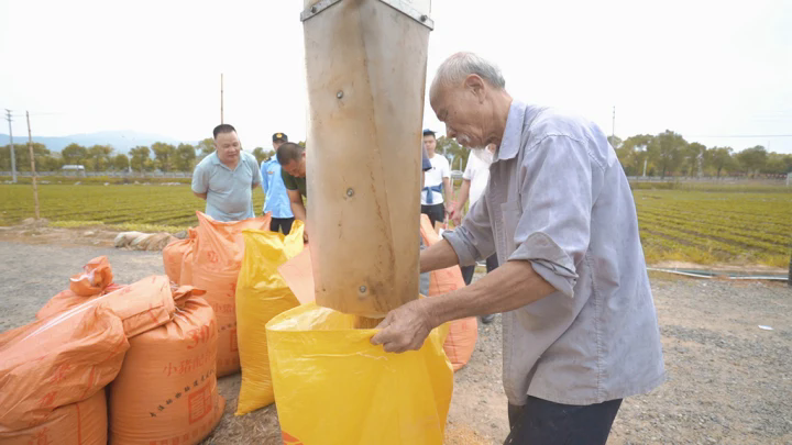 十余分鐘后,滿載的收割機(jī)緩緩?fù)T谔锕∵吷希瘘S的稻谷隨著收割機(jī)的管道傾瀉而下,農(nóng)戶們?cè)诘缆放悦χb袋、打包。一個(gè)個(gè)裝滿水稻的麻袋在田埂上“整齊列隊(duì)”,大家的臉上洋溢著豐收的喜悅。