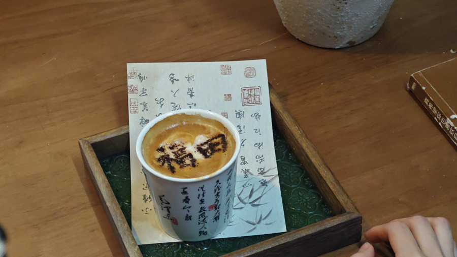 “您點的咖啡和茶點來了。”談笑聲與快門聲之間,不急茶舍老板李文居端著兩杯咖啡走了進來。杯面上寫有福田二字的咖啡拉花與形似柿子的水果的糕點,引來游客陣陣贊嘆與多臺相機的聚焦。
