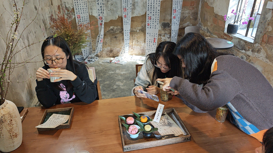穿過院子步入客廳,幾位游客正圍著茶臺品茶、漫談。經(jīng)過修繕的老墻上,掛著書法作品、竹木掛簾以及數(shù)件供游客拍照的漢服。房間內(nèi),兩名游客正在聚光燈下拍照打卡,記錄當下的美好。