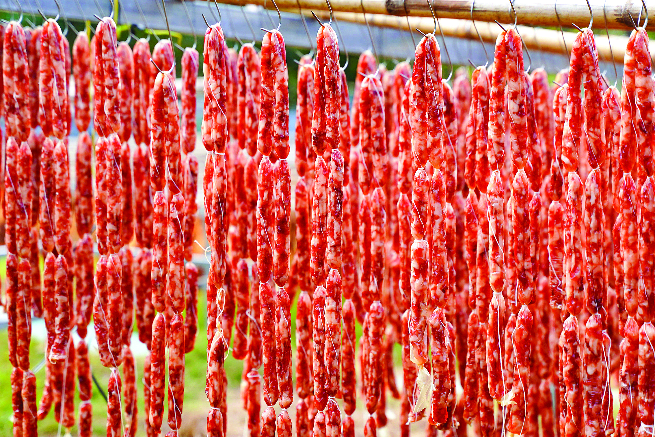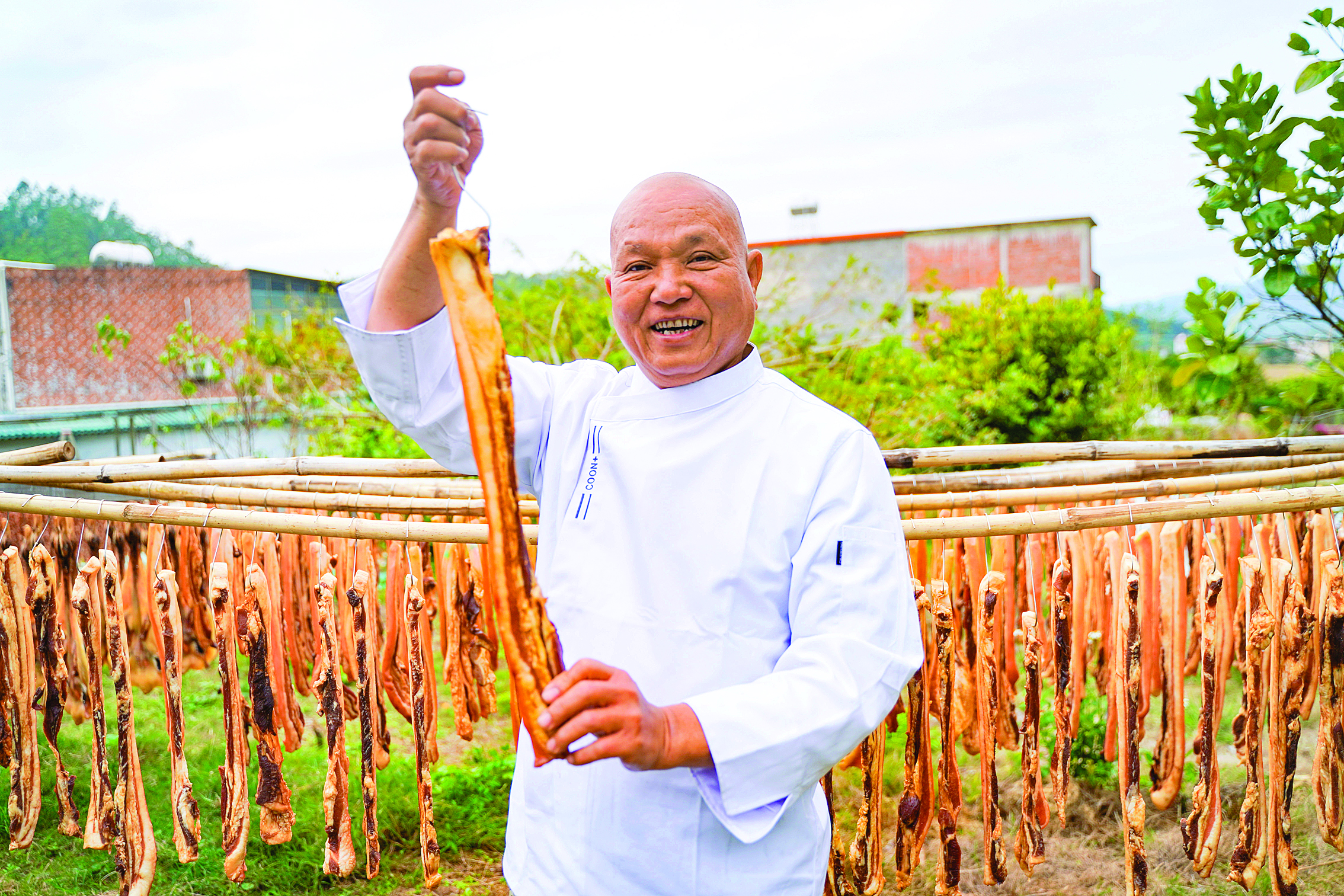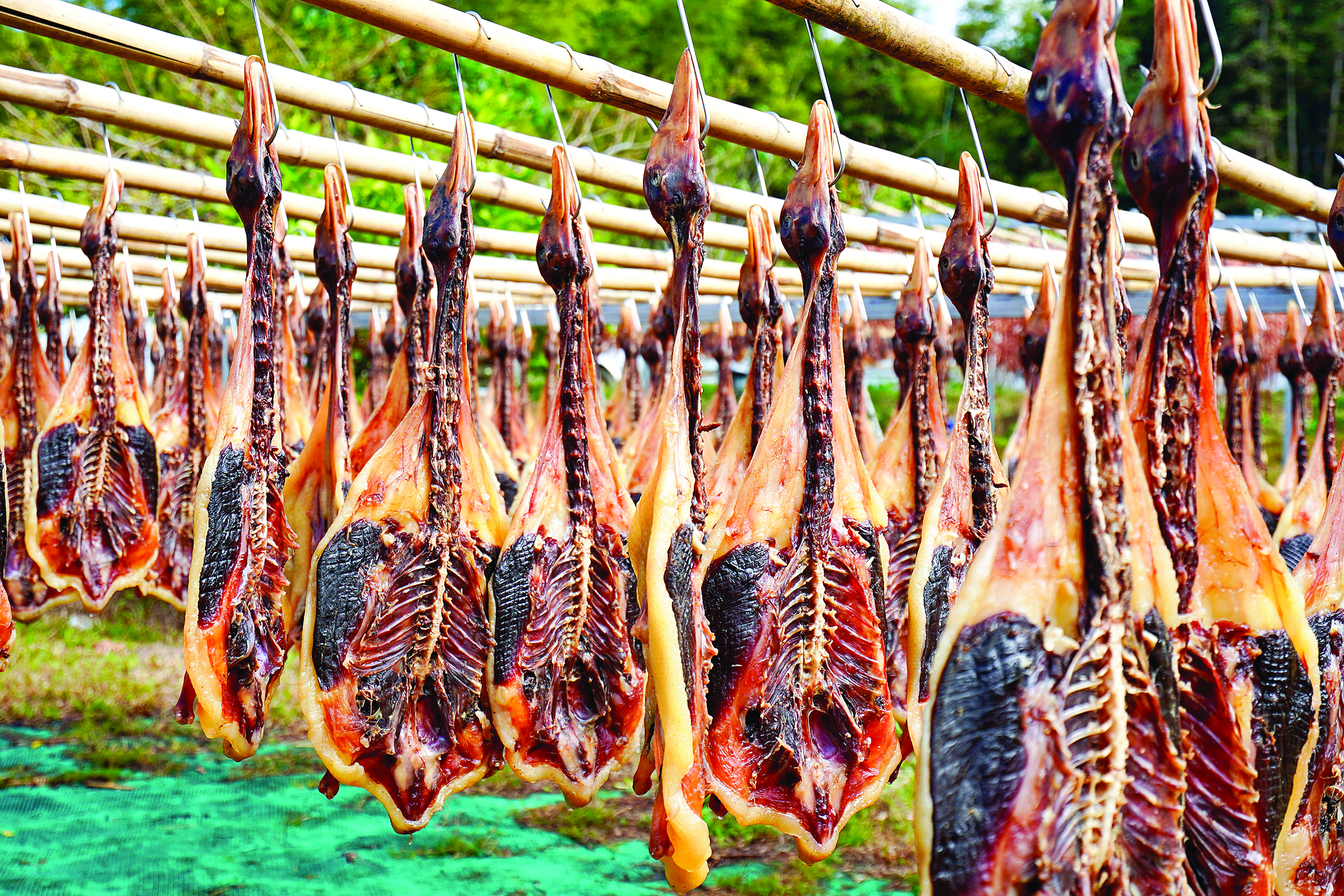 張炎金說(shuō),選好食材是制作臘味的第一步,也是關(guān)鍵一步。制作時(shí),盡量保留食材本味,只用姜、鹽、醬油、酒等調(diào)料。這樣,食客在傳統(tǒng)的咸香中可以品味到橫河食材的地道。“這是橫河臘味的特色,也是游客喜歡橫河臘味的原因。”