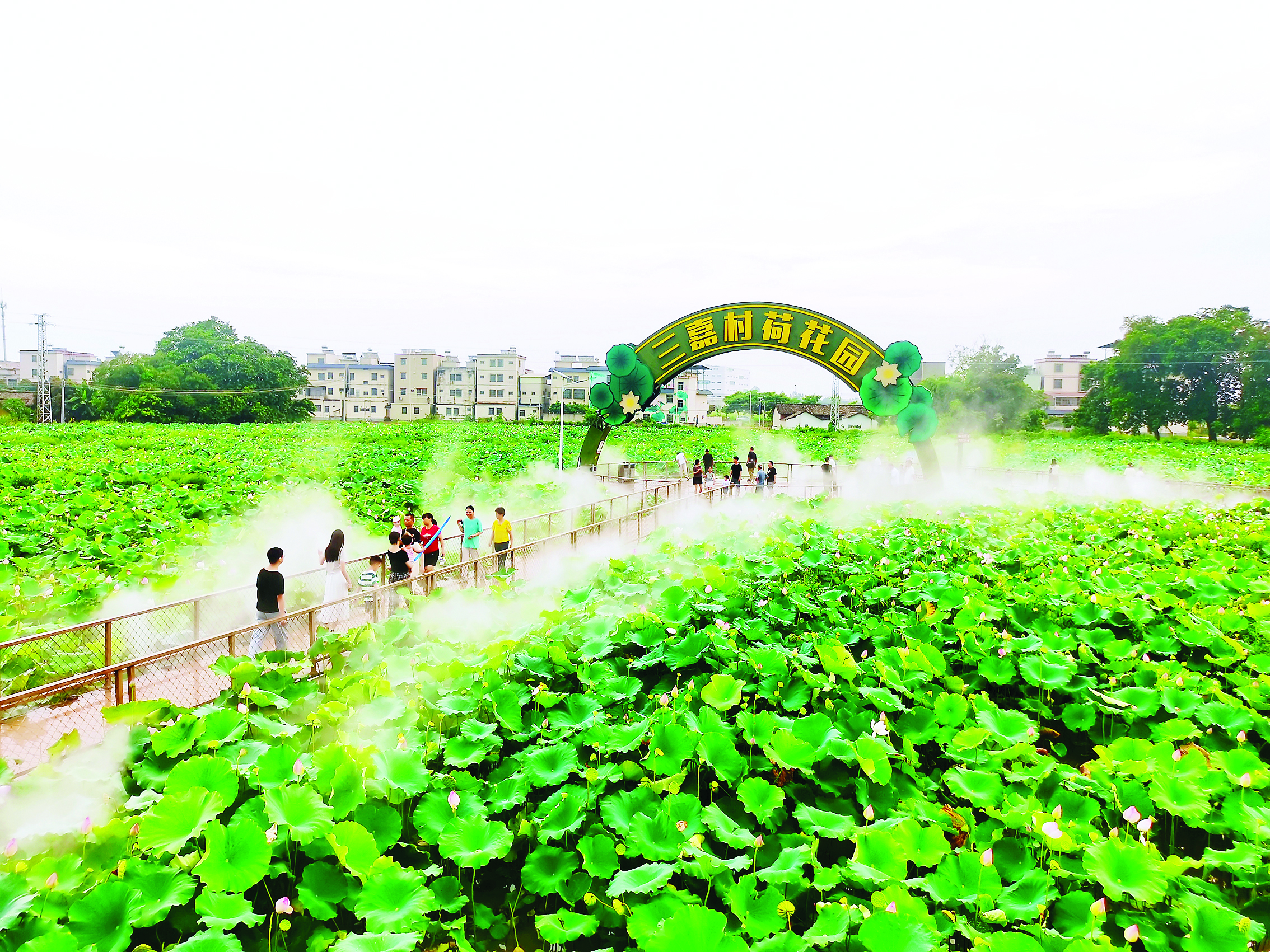 綠蓋疊翠間,粉白嫣紅綴滿碧波。三嘉村的百畝荷花園如同一幅徐徐展開的田園畫卷,眾多游客沉醉其中。層層疊疊的荷葉間荷花挺立,有的含苞待放,有的開得正艷。微風(fēng)拂過,荷花隨之搖曳,仿佛在向游客們招手,陣陣荷香沁人心脾。
