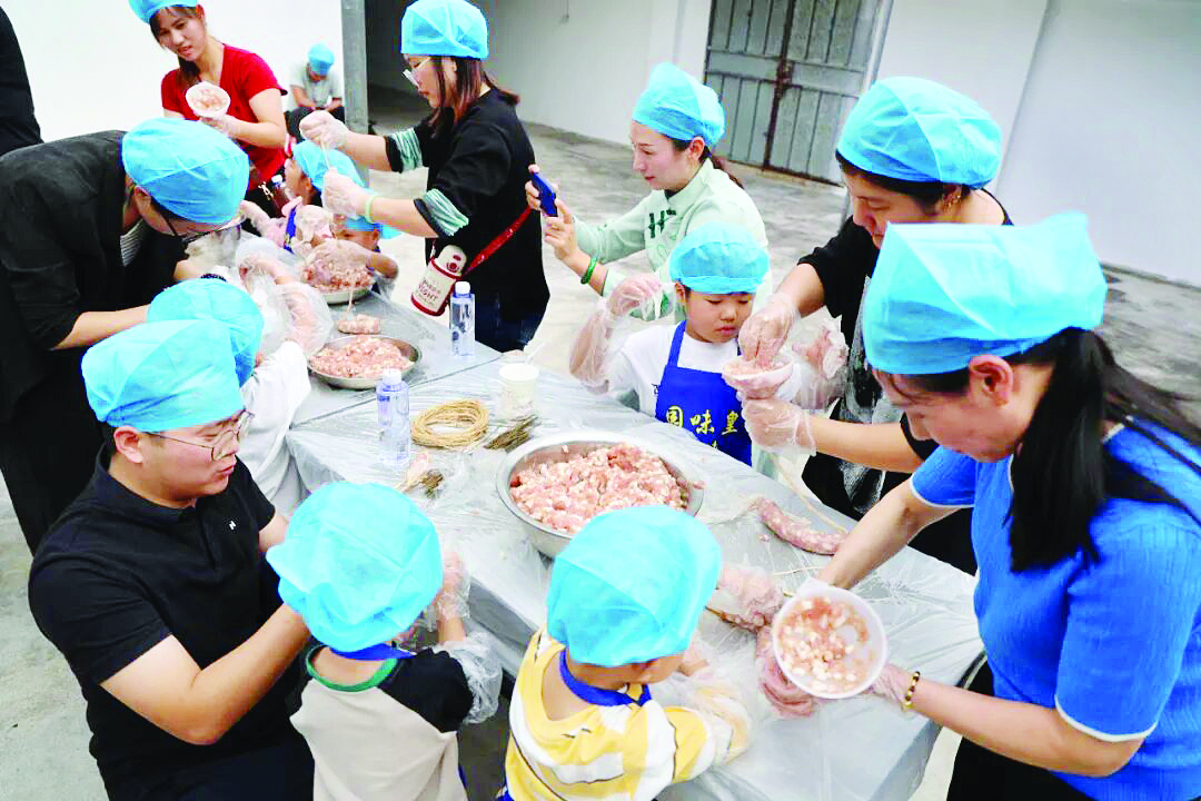 實(shí)操體驗(yàn)環(huán)節(jié)更是熱鬧非凡。在李師傅的指導(dǎo)下,親子家庭分工協(xié)作,捋腸衣、灌肉餡、扎氣孔、綁繩結(jié)、定形狀,每一個(gè)步驟都做得一絲不茍。指尖翻飛間,一根根形態(tài)飽滿的新鮮臘腸逐漸成型。大家一邊操作,一邊交流技巧,感受非遺技藝的獨(dú)特魅力。