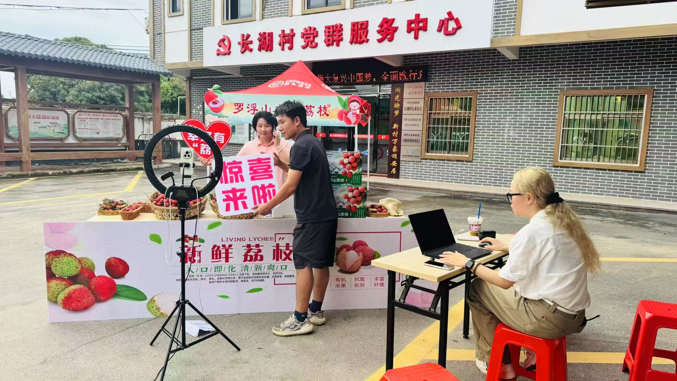 今年荔枝季,長(zhǎng)湖村新農(nóng)人利用“鄉(xiāng)村直播間”推介荔枝。龍溪街道供圖
