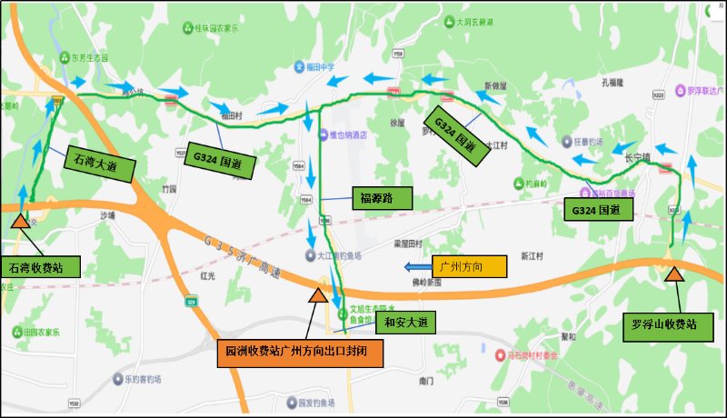 園洲收費(fèi)站廣州方向出口封閉繞行示意圖。