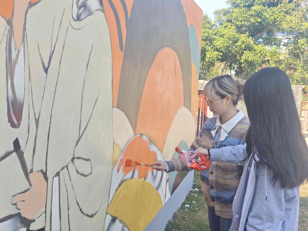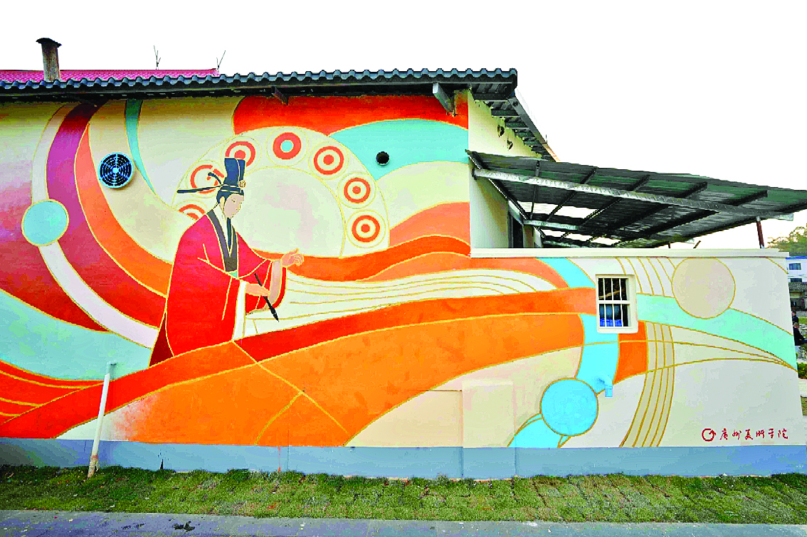 在一幅“孔子拜老子”主題墻繪中,兩位古代圣賢形象生動,色彩搭配既古雅又鮮活,構(gòu)圖充滿現(xiàn)代感。“這個故事蘊含著‘上善若水’‘百善孝為先’的深刻道理。”廣州美術(shù)學(xué)院繪畫藝術(shù)學(xué)院黨總支書記何周宇介紹,“我們不僅保留了典故的精神內(nèi)核,還通過色彩與構(gòu)成上的創(chuàng)新,讓作品更符合當代審美,尤其是年輕人的審美趣味。”