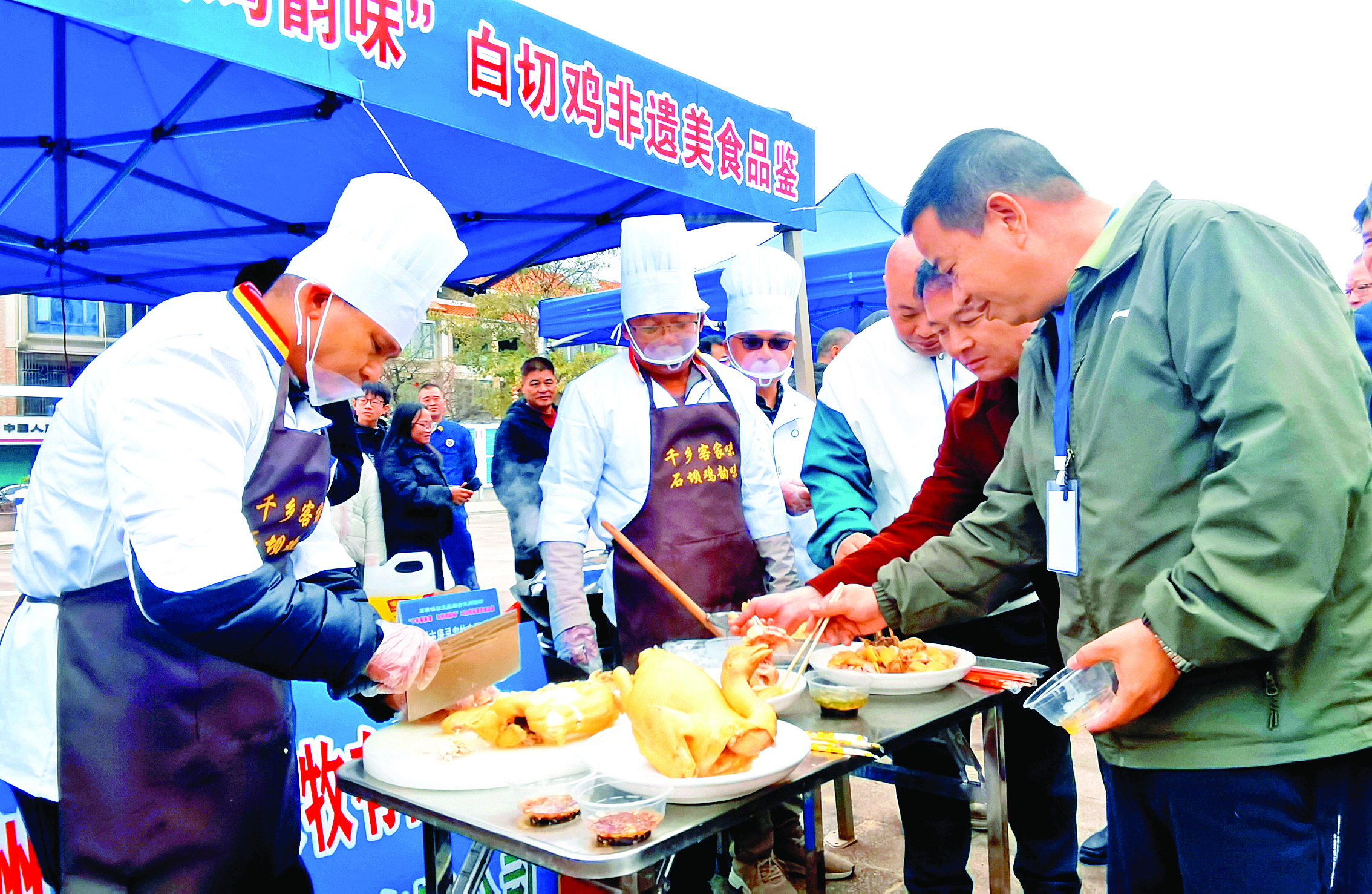 現(xiàn)場上演了非遺技藝競技,10組由本地餐飲企業(yè)、三黃胡須雞養(yǎng)殖企業(yè)組成的團隊同臺比拼,展示白切雞制作流程。“這組的雞皮Q彈不膩,完美還原了客家白切雞的本味”“養(yǎng)殖企業(yè)直供的雞源新鮮度十足,肉質(zhì)緊實有嚼勁”……專業(yè)點評之余,互動交流環(huán)節(jié)更是熱鬧非凡,游客主動向傳承人請教烹飪技巧,詢問食材選購要點。