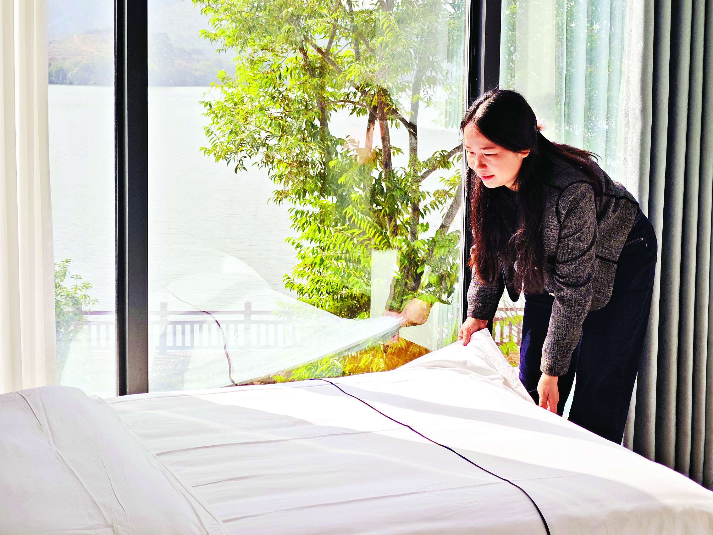 喻肖榮在整理民宿的客房。