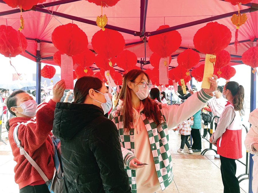 漁歌表演環(huán)節(jié)暫告一段落,豐富的游園活動(dòng)吸引了眾多市民打卡玩耍。現(xiàn)場除了有經(jīng)典的游園游戲套圈圈、投壺外,還少不了元宵佳節(jié)的傳統(tǒng)活動(dòng)——猜燈謎。一條條寫滿節(jié)日祝福和充滿智慧幽默的燈謎受到市民的熱捧,大家對(duì)著燈謎或苦思冥想,或熱烈討論,猜中的歡呼雀躍,沒猜中的也“豁然開朗”哈哈大笑,現(xiàn)場一片歡樂祥和的氣氛。