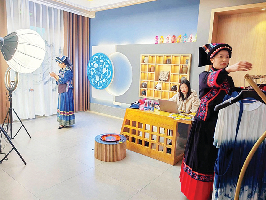 阿妹戚托小鎮(zhèn)是全國唯一的易地扶貧整鄉(xiāng)搬遷特色小鎮(zhèn),也是國家4A級旅游景區(qū)。在富有民族特色的小鎮(zhèn)臨街一排樓房,黨群“山海同心”圓夢空間的牌子格外醒目。記者現(xiàn)場看到,黨群“山海同心”圓夢空間分為門面相向的A、B兩區(qū)。走進圓夢空間,一股清新而溫馨的感覺撲面而來,各個功能區(qū)劃分自然而緊湊。A區(qū)主要設置了黨群“山海同心”工程宣傳推廣、夢想點亮、學習培訓交流、支教助學等服務功能;B區(qū)主要功能為青年創(chuàng)業(yè)扶持、非物質(zhì)文化遺產(chǎn)傳習和直播帶貨平臺。在一個設備齊全、光線明亮的直播間里,全國人大代表、貴州布依垚文化發(fā)展有限責任公司董事長李利正和她的團隊進行直播帶貨。