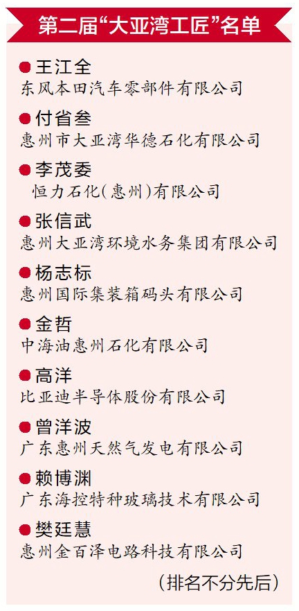 第二屆“大亞灣工匠”10名候選人名單于日前出爐,東風(fēng)本田汽車零部件有限公司王江全等10人獲評第二屆“大亞灣工匠”。這10位工匠的年齡集中為“70后”“80后”,都是扎根在石油化工、新能源新材料、高端裝備制造、環(huán)保治理等重點產(chǎn)業(yè)的技術(shù)崗位帶頭人、研發(fā)工程師。據(jù)了解,第二屆“大亞灣工匠”將獲頒“大亞灣工匠”榮譽證書、紀(jì)念章,納入?yún)^(qū)委人才辦人才庫管理并予以獎勵等。