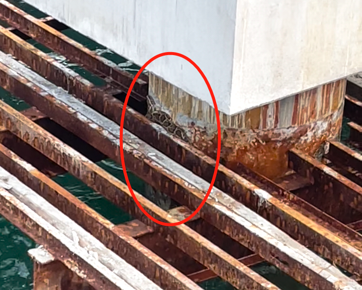 一條蟒蛇被困在施工鐵架上
