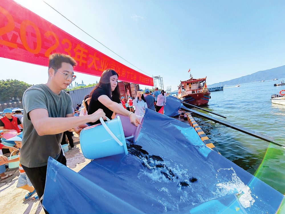 魚苗放流大海。惠州日?qǐng)?bào)記者匡湘鄂 通訊員陳志敏 攝