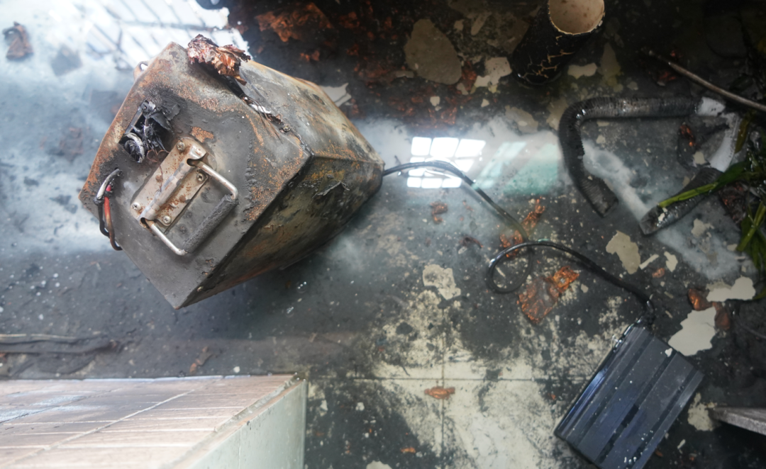 電瓶燃燒燒破陽臺pvc水管,水管噴灑出水將火情控制,火勢未進(jìn)一步擴(kuò)大。事發(fā)后內(nèi)部墻體被濃煙嚴(yán)重熏黑,現(xiàn)場一片狼藉,所幸未造成人員傷亡。