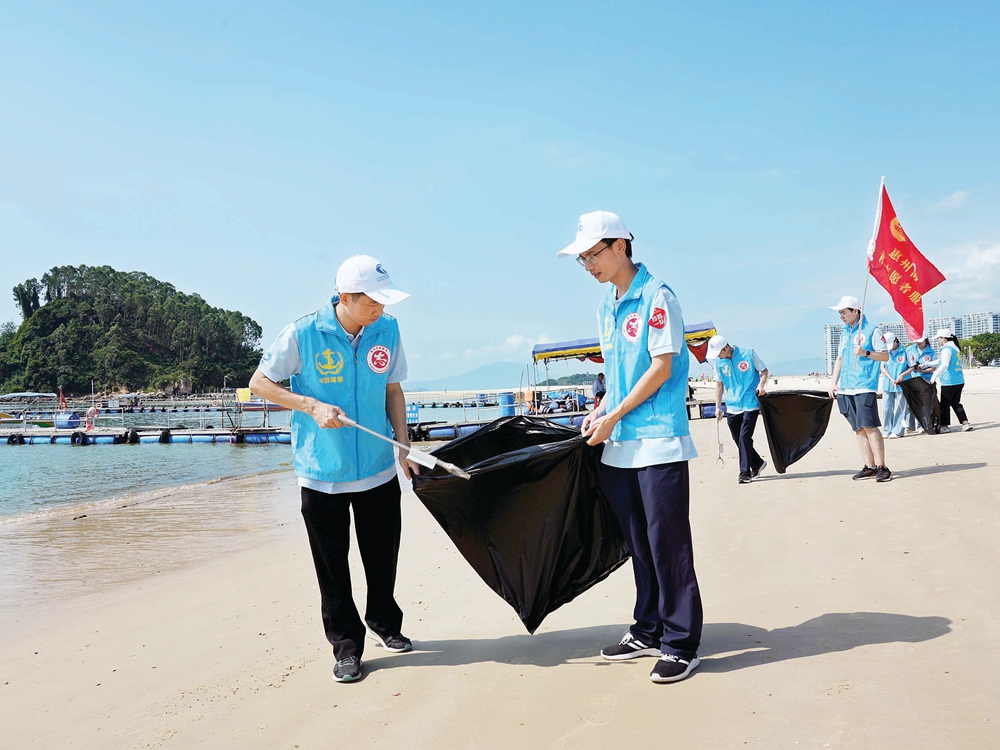 志愿者在大亞灣黃金海岸及附近海域清理垃圾。惠州日?qǐng)?bào)記者張藝明 攝