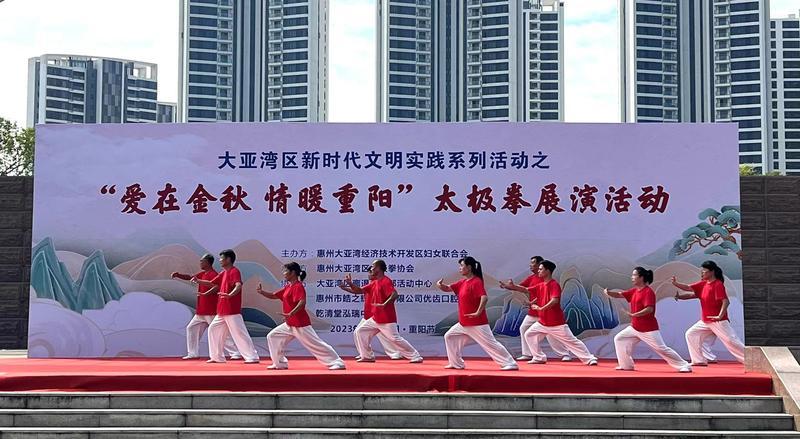惠州日?qǐng)?bào)訊 (記者匡湘鄂 通訊員彭麗麗 詹彩鳳)時(shí)而如行云流水,時(shí)而剛勁有力,一柔一剛中盡顯太極的精妙……10月23日是今年的重陽(yáng)佳節(jié),當(dāng)天上午,大亞灣區(qū)新時(shí)代文明實(shí)踐系列活動(dòng)之“愛(ài)在金秋 情暖重陽(yáng)”太極拳展演活動(dòng)在惠民廣場(chǎng)舉行,來(lái)自區(qū)太極拳協(xié)會(huì)、區(qū)廣場(chǎng)舞者協(xié)會(huì)的16支參演隊(duì)伍參加活動(dòng),展現(xiàn)了大亞灣老年人的風(fēng)采。