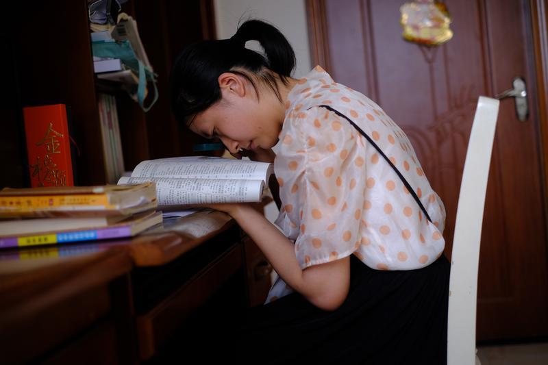 駱梓儀依靠放大鏡研究志愿填報(bào)相關(guān)書(shū)籍。