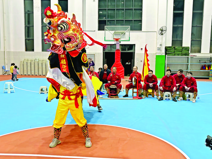 盡管獅套還不算十分完整,但是隊員們努力將成果展示在村民面前。匯演現(xiàn)場,伴隨著鏗鏘有力的鑼鼓,一頭活蹦亂跳的“麒麟獅”率先“闖”進了場館。一開始搖頭擺尾,左顧右盼;一會兒又高高騰起,活蹦亂跳;一會兒到處“覓食”,歡快起舞……隊員們將麒麟獅活潑可愛又憨態(tài)可掬的形態(tài)表現(xiàn)出來。