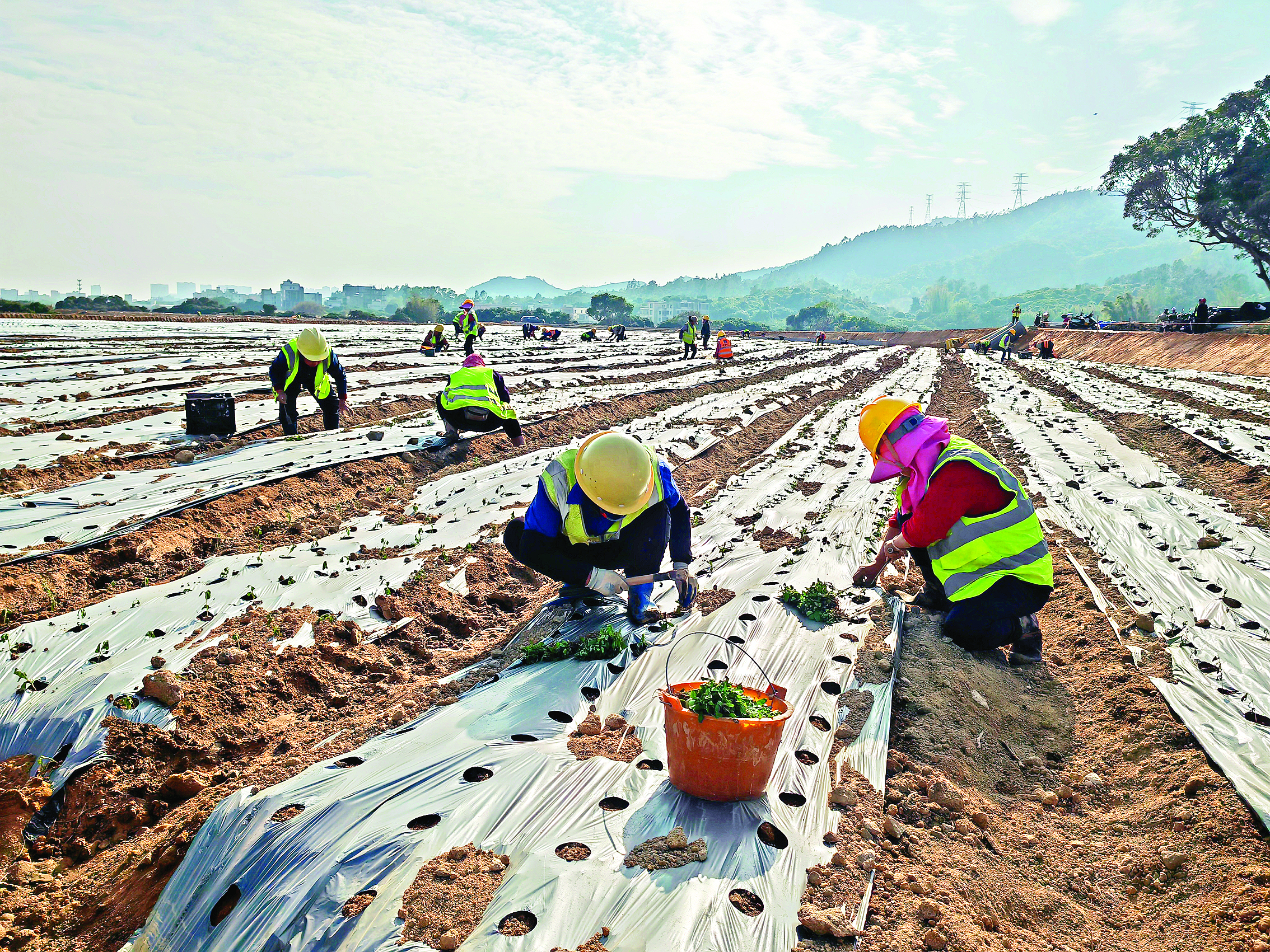 2025年新年第一天,大亞灣開發(fā)區(qū)霞涌街道上角村魷魚灣水庫下,一片開闊的新開墾耕地沐浴在溫暖的陽光下。100多名移苗工正在地里種植甜葉菊,現(xiàn)場一派冬種忙碌的景象。