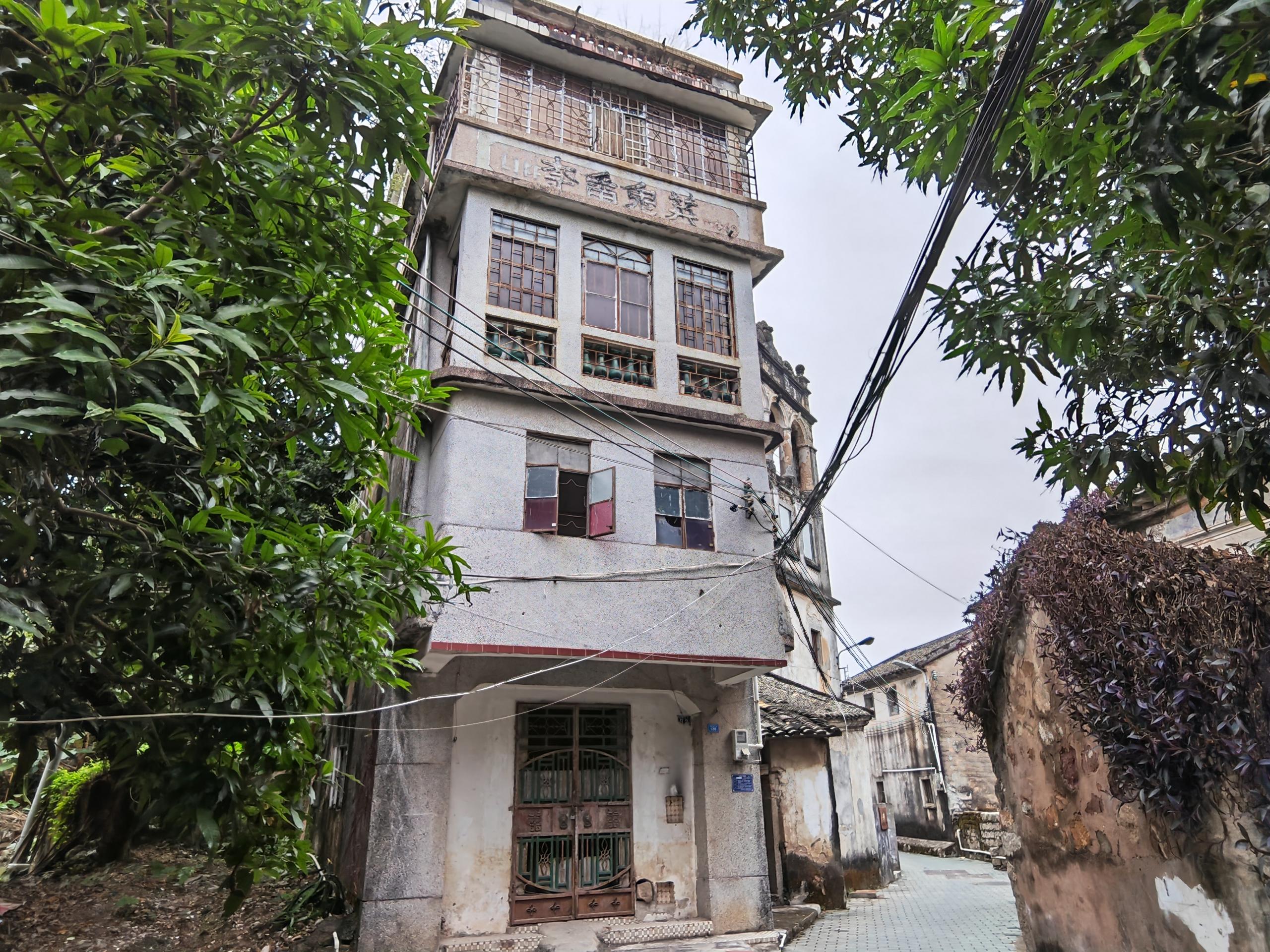 134號“李氏宅居樓”是一處柱廊式4層建筑,磚混結(jié)構(gòu)。建筑既有客家人的圍屋特征,也有中西結(jié)合的影子:入口處矮墻圍合出一個小院;一層三個門窗是西洋風(fēng)格的拱圈,拱圈內(nèi)裝飾浮雕為中式的荷花、喜字等圖案。幾年前,大亞灣開發(fā)區(qū)當(dāng)代油畫院院長李子行將這座老建筑接手過來“修舊如舊”,打造成“惠州大亞灣區(qū)當(dāng)代油畫院”。如今該建筑也成為村里吸引游客、文旅融合的新亮點(diǎn)。